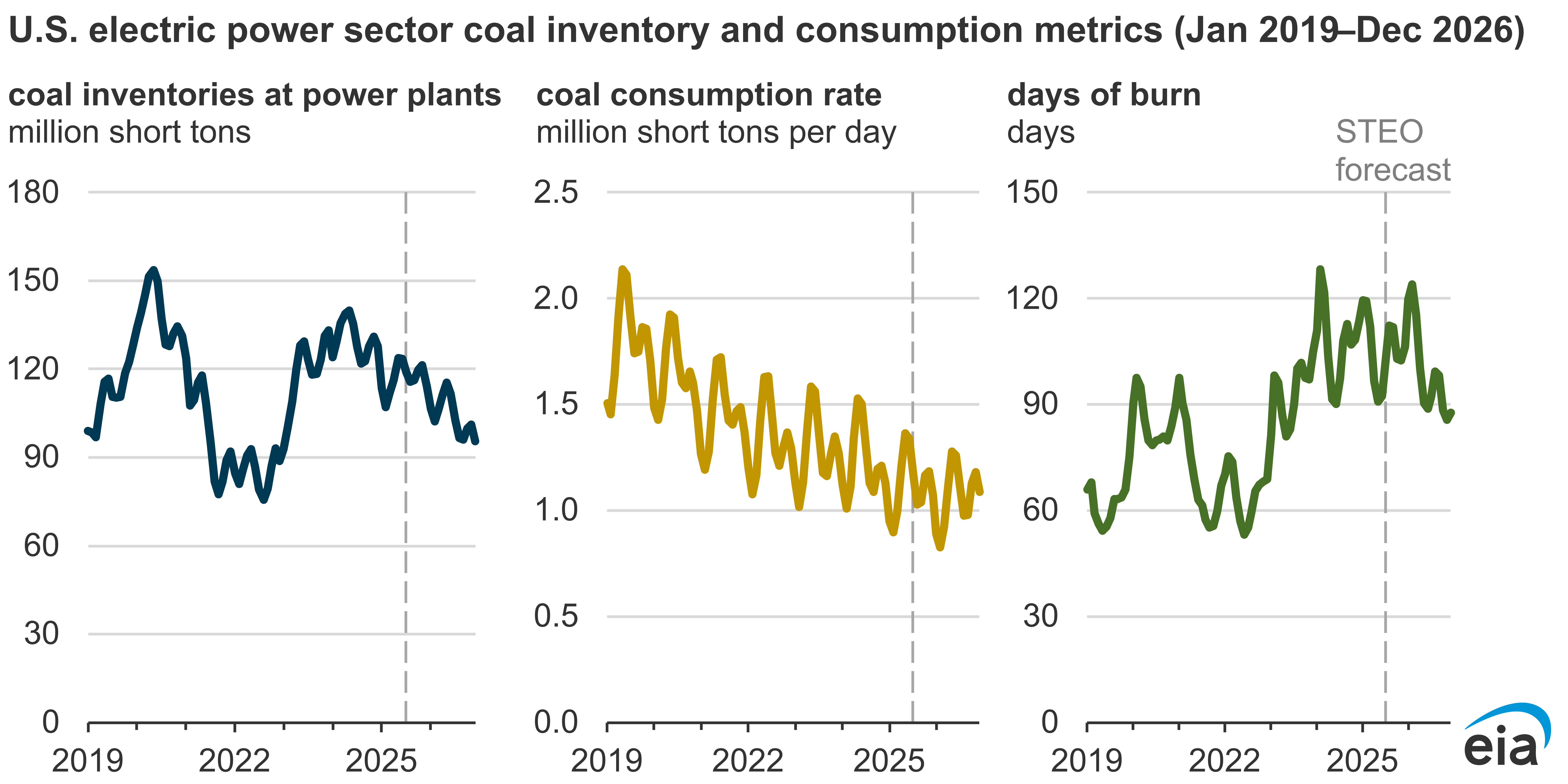 This metric, also called days of burn, is calculated by dividing coal inventories held at power plants by a seasonal consumption rate. "We forecast days of burn will range between about 90 and 120 days between now through the end of 2026, or about a month’s worth of coal more than power plants had on-site between 2019 and 2022," EIA said.