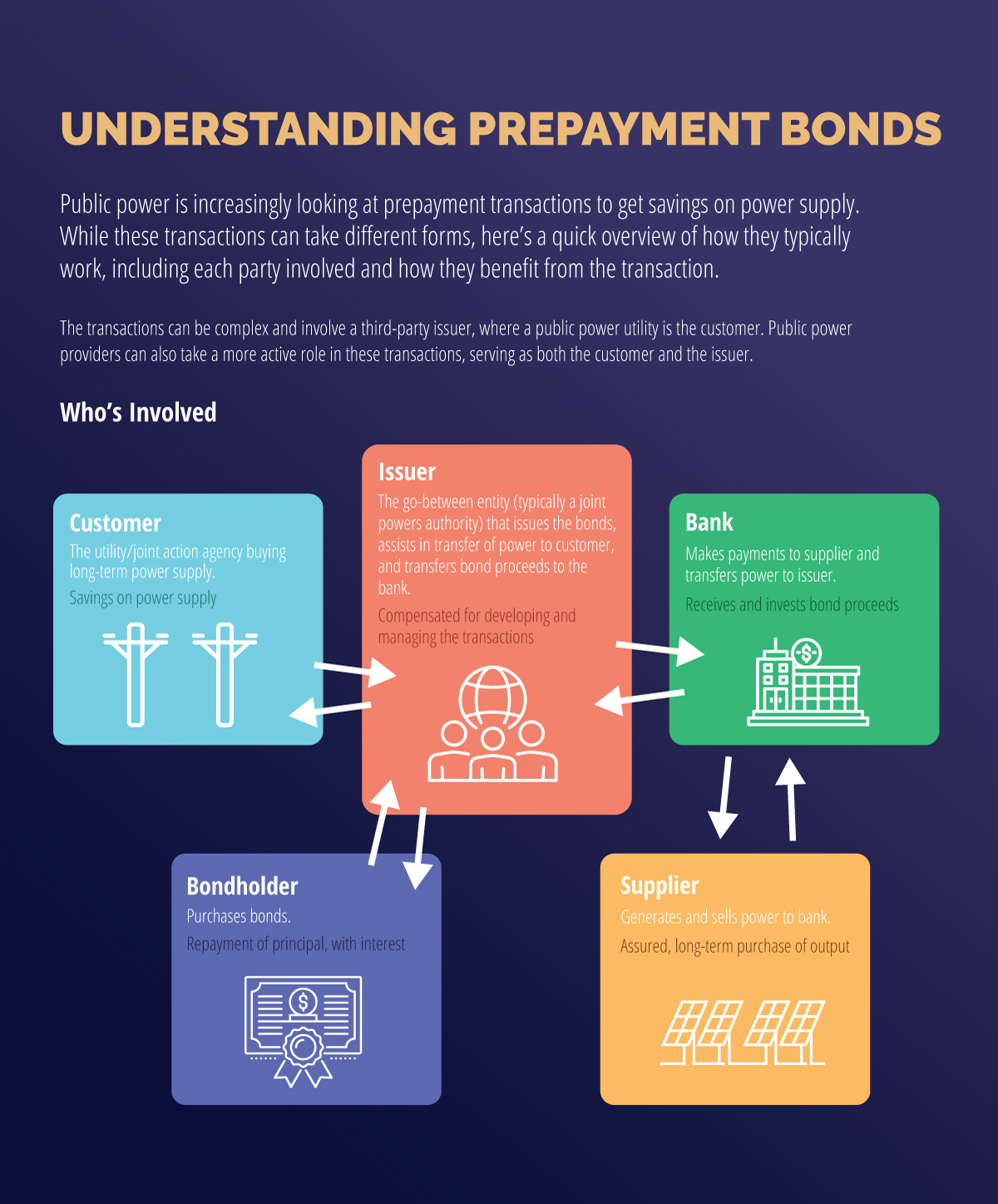 Public power is increasingly looking at prepayment transactions to get savings on power supply. While these transactions can take different forms, here’s a quick overview of how they typically work, including each party involved and how they benefit from the transaction.